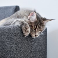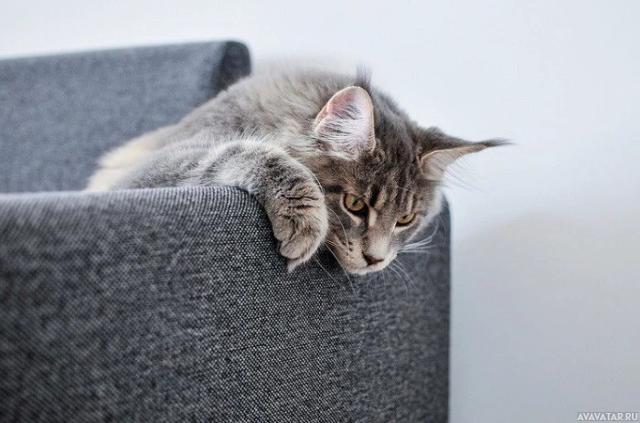 На картинке изображен серый кот, сидящий на ступеньке или маленькой платформе. Кошачьи лапы вытянуты, а глаза направлены вперед, как будто он смотрит на что-то вдалеке или, возможно, наблюдает за проходящими мимо людьми.