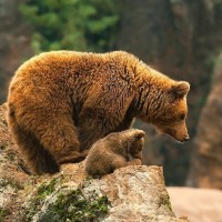 a brown bear, standing on some rocks with a green landscape in the background. There is also what appears to be a younger bear, possibly a cub or an adolescent bear, next to