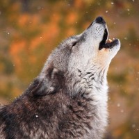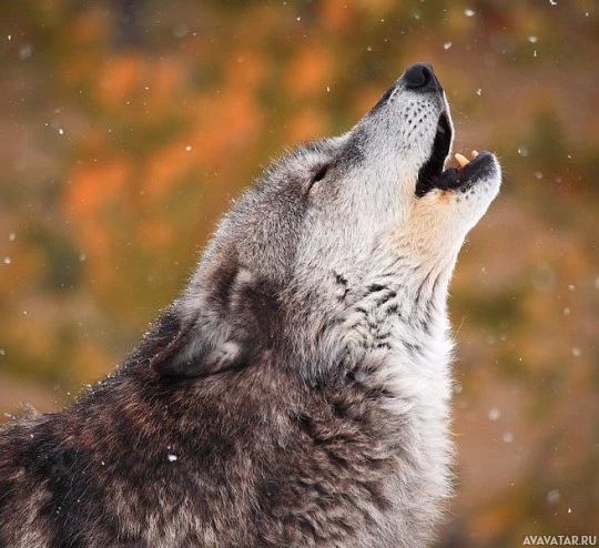 The image shows a wolf with its mouth open, as if howling or expressing emotion. It is set against a backdrop that appears to be an autumnal
