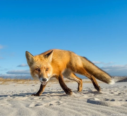 На снимке изображена рыжая лиса, бегущая по чему-то, напоминающему песчаную или грунтовую поверхность, возможно, по пляжу. Стоит ясный день с чистым небом, и лиса находится в движении, что указывает на то, что она, возможно, охотится или убегает от чего-то.