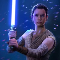 a focused expression on her face. Rey is wearing