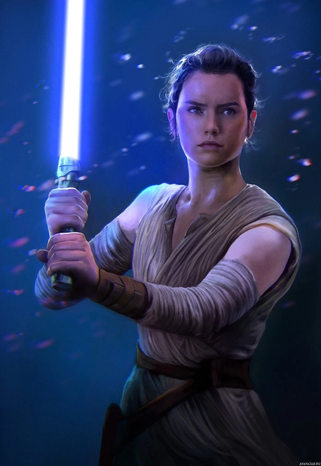 the Star Wars franchise, Rey. She is depicted holding a blue lightsaber in her right hand and looking directly at the viewer with
