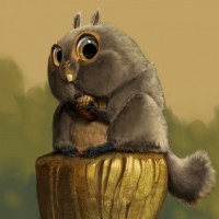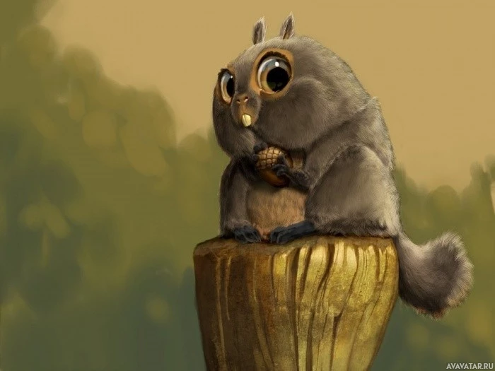 an anthropomorphic squirrel with the body of a typical squirrel but the head and posture of a human. It has long, furry ears,