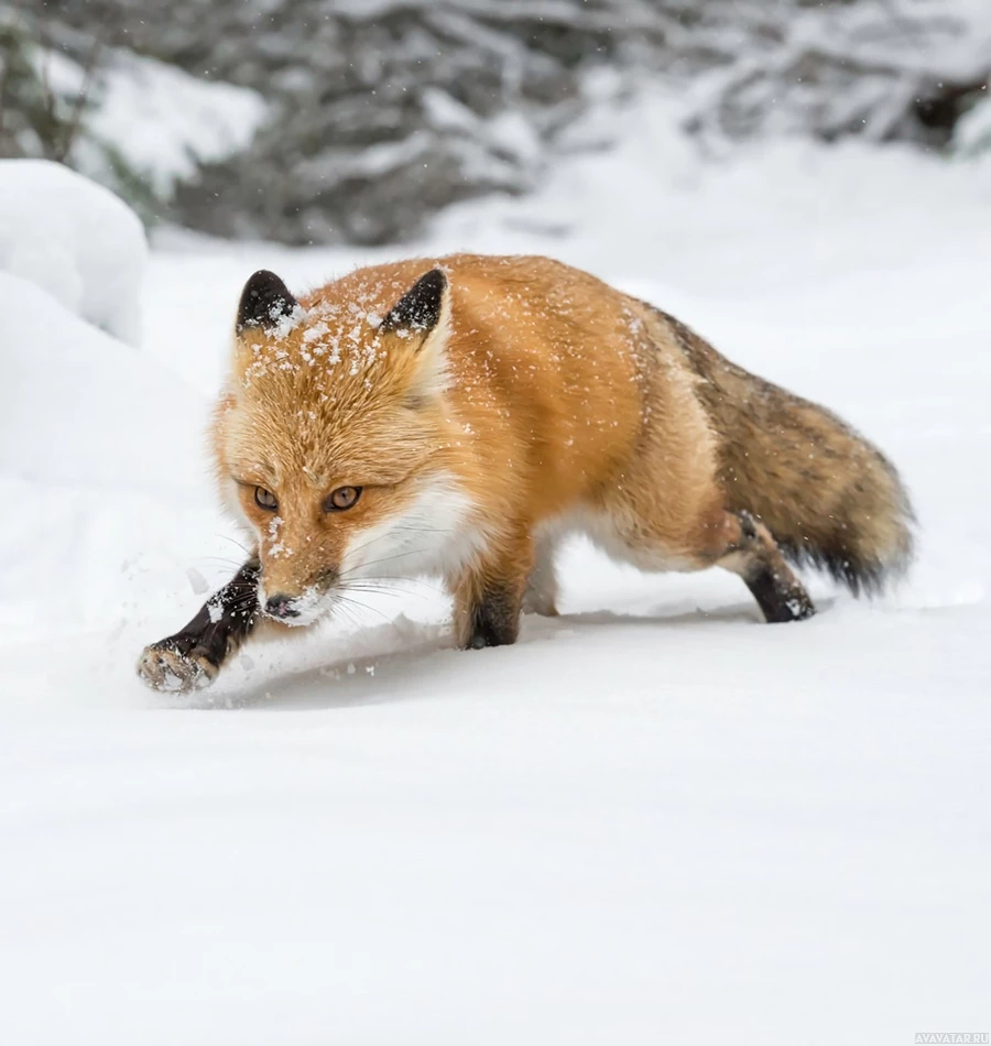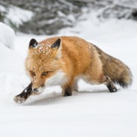 a red fox in snowy conditions. It appears to be running or walking through the snow, which suggests it might be hunting or trying to find its
