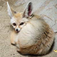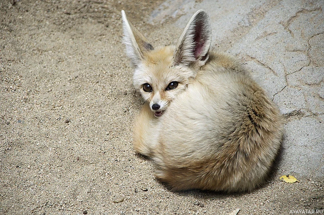 a red fox sitting on a sandy surface. It appears to be looking at the camera with a somewhat