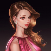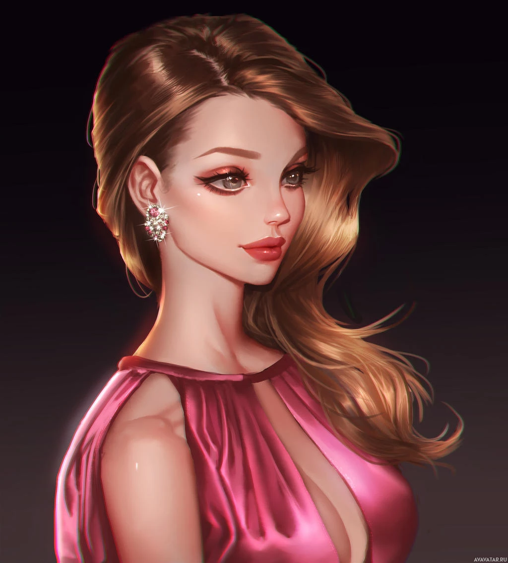 На картинке изображено цифровое произведение женского характера. У нее длинные, волнистые светлые волосы и она носит макияж, который включает темную тень для глаз и помаду. Ее наряд состоит из безрукавного, глубоко-V розового платья с рифлями на плечах и драпированным вырезом. Общий стиль предполагает, что этот персонаж может быть из мультсериала или видеоигры.