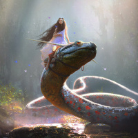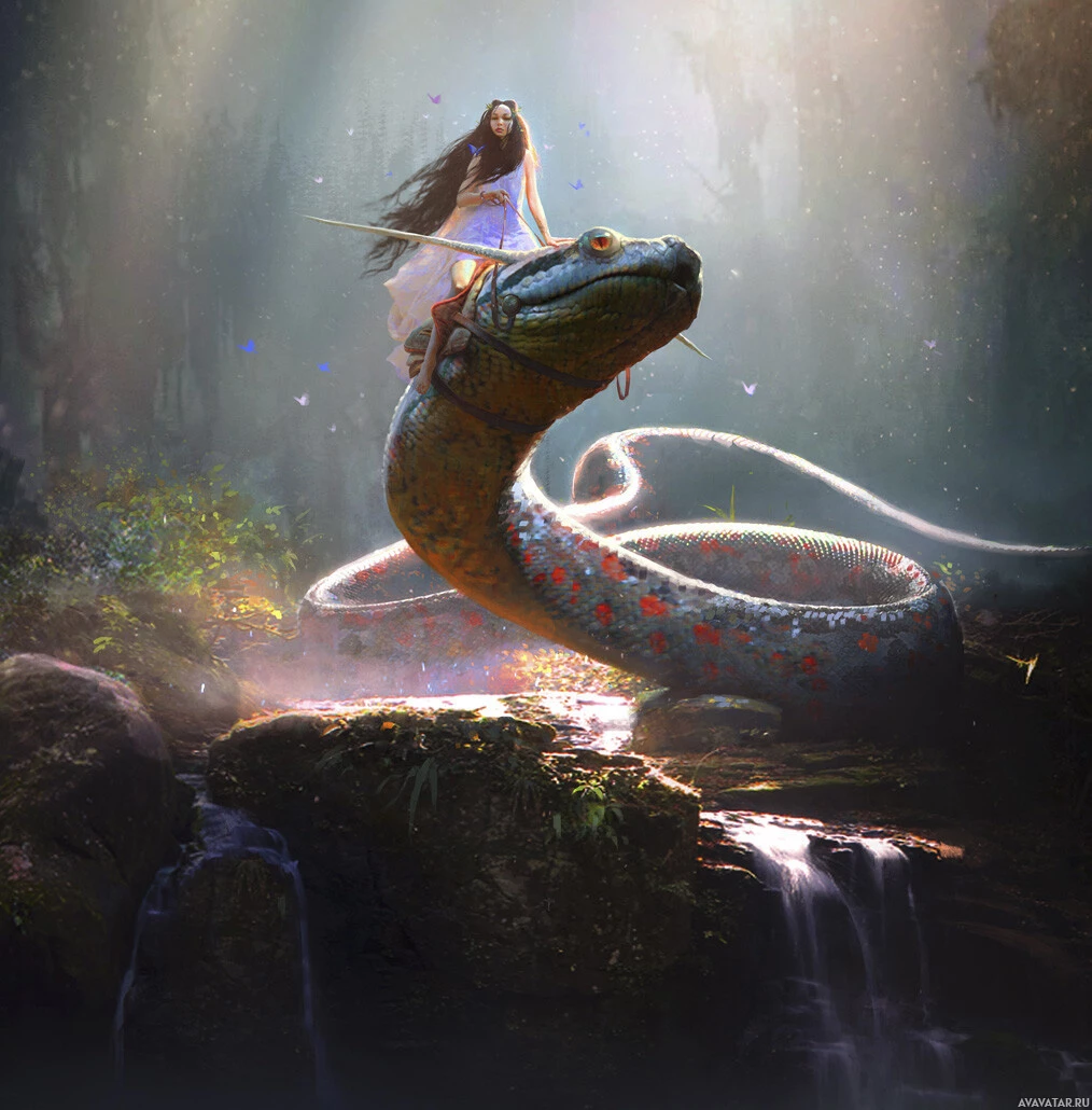 a fantastical scene featuring a girl riding on the back of a snake. The setting appears to be a lush,