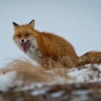 snowy habitat. The fox is captured mid-motion with its mouth open as if it's growling or communicating with something out of view. Its fur appears wet and disheveled, suggesting