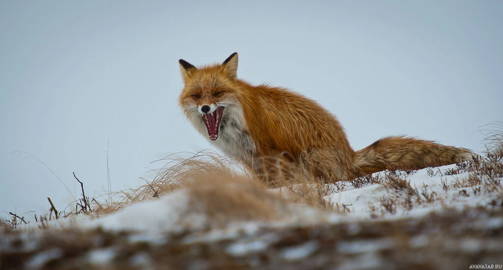 recent activity or exposure to the elements. The background is a blend of grasses covered in snow, indicating
