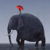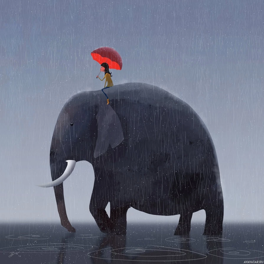 a whimsical scene where an elephant is depicted as large and walking on what appears to be water. On top of the elephant, there is a person holding an umbrella, seemingly enjoying the ride despite the rain. The atmosphere suggests that it's