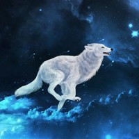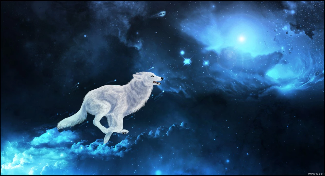 a cosmic background with stars and nebulous patterns that suggest the scene is taking place in space. The wolf has
