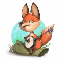 The image shows an animated red fox character sitting on a log, holding a banjo. It appears to be in a natural outdoor setting, possibly indicating that the fox is playing music or enjoying leisure time.