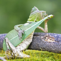 The picture shows a chameleon sitting on a branch, holding what appears to be
