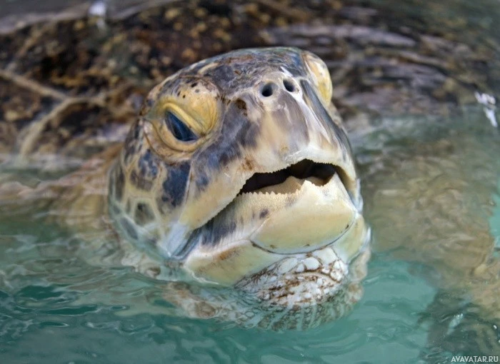 The image shows a turtle swimming in