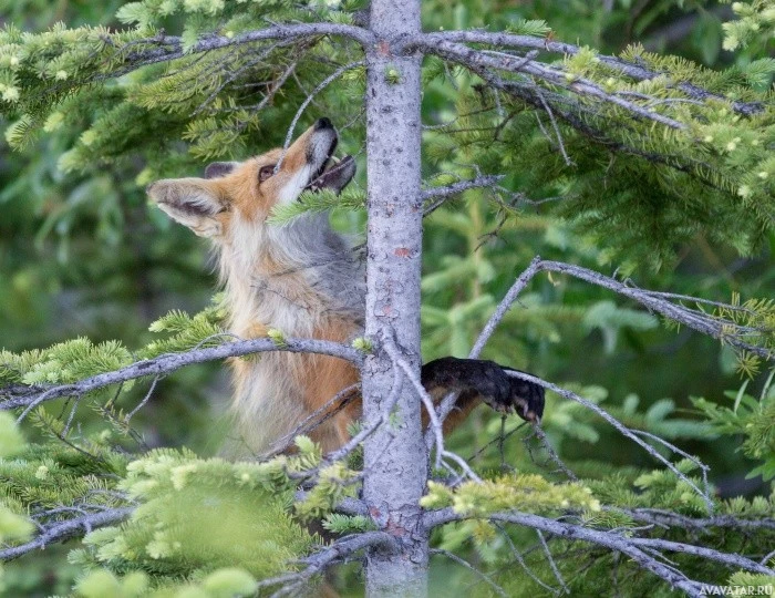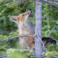 a forest setting. It appears to be interacting with its surroundings, possibly sniffing or inspecting something near the trees. The photo seems to capture multiple moments of this action, as it includes at least two