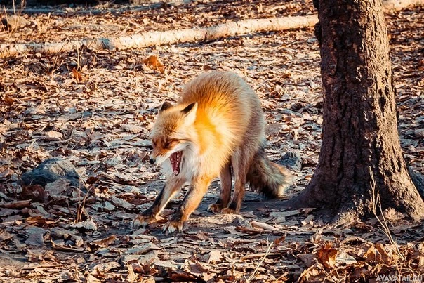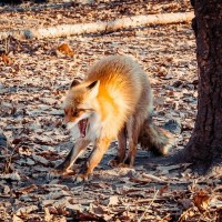 an outdoor setting with what looks like fallen leaves on the ground, possibly during autumn. The fox is captured mid-motion, with its mouth open and paw raised, which could suggest that it is either yawning or reacting to something in its environment.