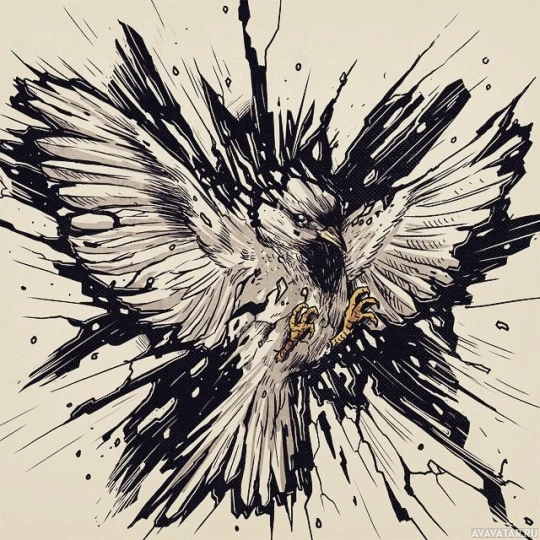 shattered glass. This could symbolize damage, destruction, or chaos around the sparrow. The background is otherwise blank, allowing the viewer to focus on this