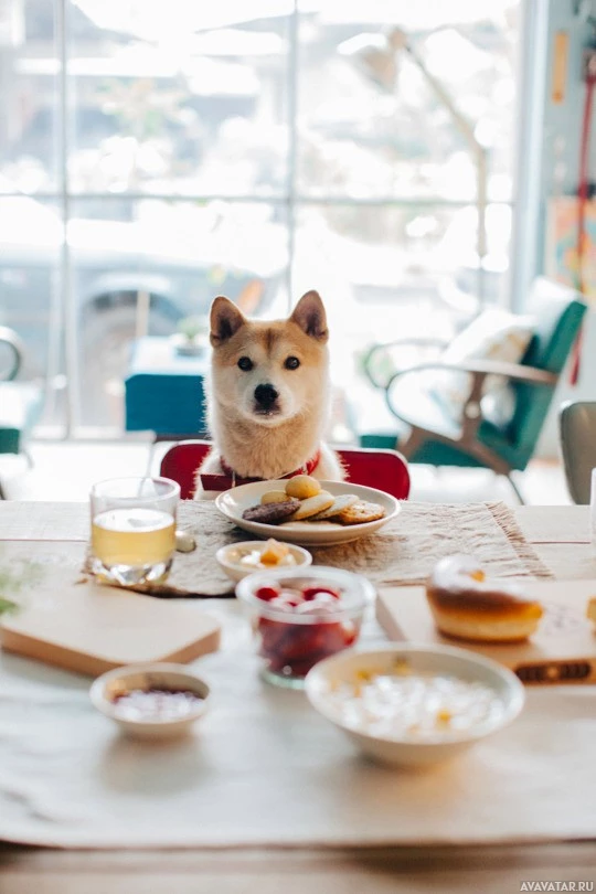 items on the table, such as cups, a bottle, a spoon, and some fruits. This is an amusing setup, likely staged for