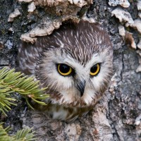 На картинке изображена сова, сидящая внутри ствола дерева. Голова совы высовывается через отверстие в дереве, и она, кажется, смотрит прямо в камеру, видя желтые глаза. Такое поведение гнездования или отдыха в выдолбленных деревьях характерно для некоторых видов сов.