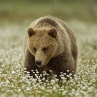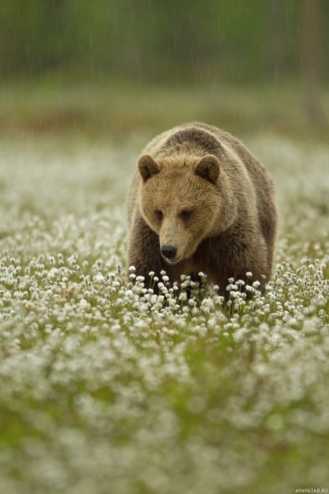 brown bear walking through a field covered in white flowers. It appears to be raining, as the grass is damp and there are raindrops visible on