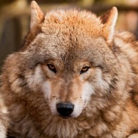 The image features a wolf sitting or laying down. It appears to be a close-up shot, focusing on the wolf's head and upper body. The fur looks thick and possibly wet, indicating that it could be captured during