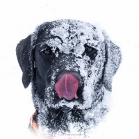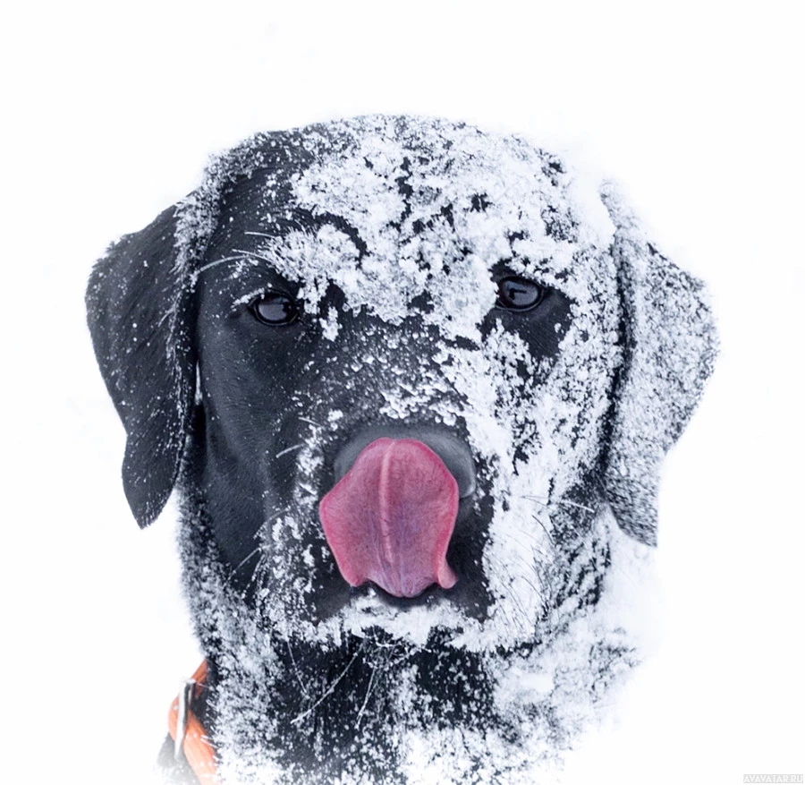На снимке изображена собака лабрадор, покрытая снегом. Рот собаки открыт, как будто она наслаждается снежной средой или, возможно, игриво высовывает язык. Собака, кажется, стоит на вершине слоя свежего снега.