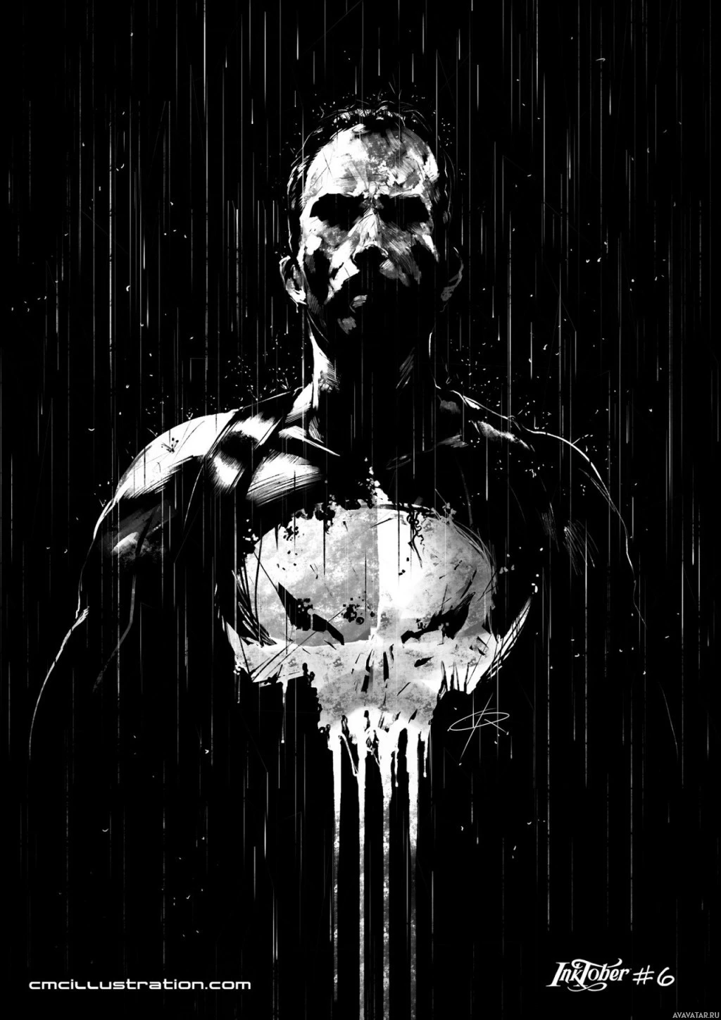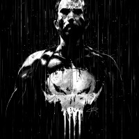 skull emblem on the chest of his costume, which consists of black and white colors with shades of gray that give it a gritty appearance. The Punisher is holding a gun, suggesting he might be involved in combat or preparing for action. The background features what appears to be rain or falling