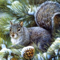 На снимке изображена белка, сидящая в снегу среди вечнозеленых ветвей. Белка обращена вправо с пушистым мехом, возможно, для сохранения тепла тела. Сцена выглядит как зимняя сцена, вероятно, после снегопада.