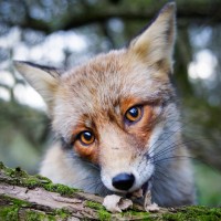 На картинке изображена лиса. Лиса, похоже, сосредоточена на чем-то в лапах, что может быть насекомым или каким-то продуктом питания, который она поймала. Он расположен рядом с тем, что кажется стволом дерева.