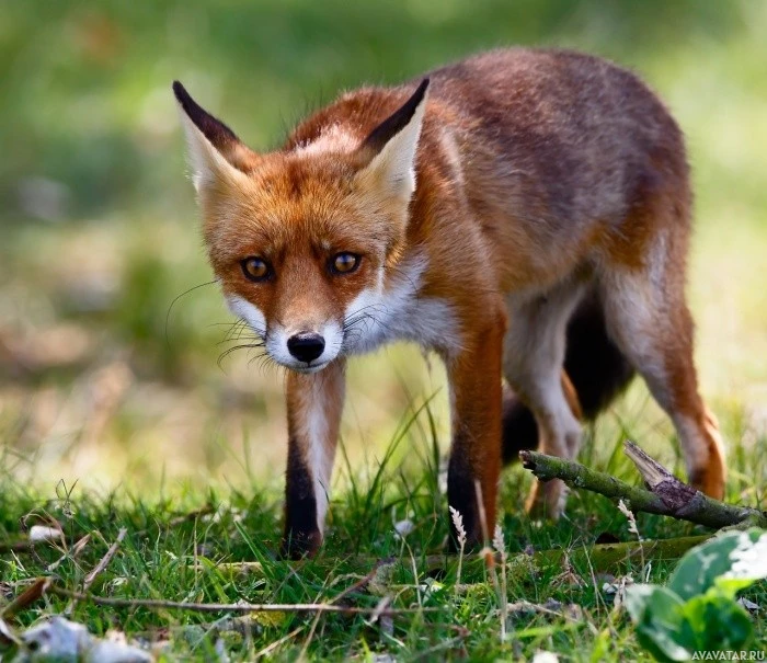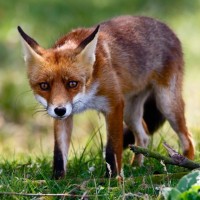a red fox standing on grass. It appears to be looking down or away from the viewer, possibly curious or focused on something in its environment. There's some foliage around, suggesting