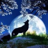 a full moon, and there are trees around with what seems like ice crystals or frost adorning their branches. This scene gives off a serene and possibly nocturnal atmosphere, with the wolf appearing attentive towards something out of frame.