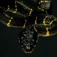 The image shows a snake with a pattern of yellow and black scales. It appears to be a close-up shot, focusing on the head and neck area of the animal. The snake's eyes are visible, and its mouth is slightly open, revealing teeth. This type of snake could potentially be a venomous species due to