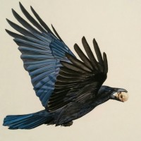 The image shows a blue crow with its wings spread wide. The bird is in flight, and its head appears to be replaced by a human skull, suggesting a symbolic or artistic depiction rather than a literal one. The use of a skull in place of the bird's head adds a surreal and macabre element to the image.