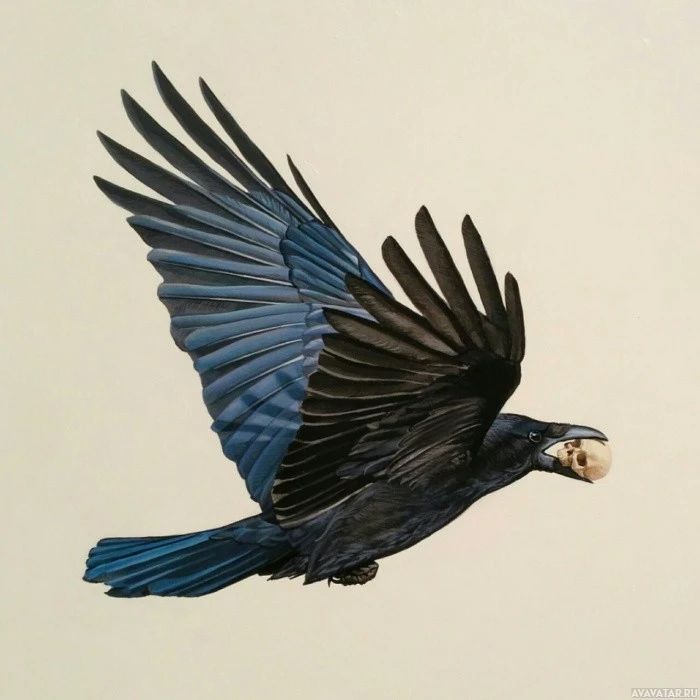 На картинке изображена синяя ворона с широко расставленными крыльями. Птица находится в полете, и ее голова, кажется, заменена человеческим черепом, предлагая символическое или художественное изображение, а не буквальное. Использование черепа на месте головы птицы добавляет к изображению сюрреалистический и жуткий элемент.