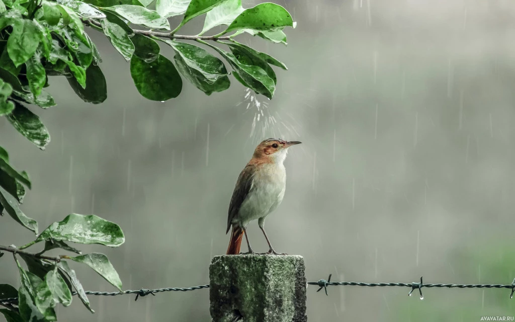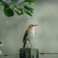 a small bird perched on a wire fence. It appears to be raining, as evidenced by the droplets visible in the air around the bird. The background is somewhat blurred but gives the impression of a green,