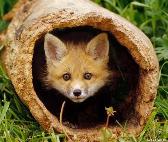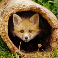На снимке изображена молодая красная лиса, выглядывающая изнутри того, что кажется бревном или стволом дерева. Лиса выглядит бодрой и расположена таким образом, что ее лицо и уши видны, когда она смотрит в окрестности. Это похоже на естественную обстановку с травой вокруг, что может указывать на среду обитания, где можно найти лисиц.