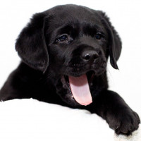 Картинка показывает молодого щенка лабрадора с высунутым языком, вероятно, слюнявого или зевающего. Кажется, что он сидит на белой поверхности и смотрит прямо в камеру.