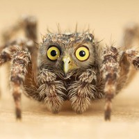 The picture shows a spider that has been digitally altered to have an owl's face. This creates a whimsical or humorous effect, as the spider appears to be displaying an "Owl"-like expression with wide open eyes and a surprised look on its body.