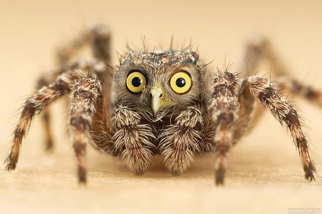 На снимке изображен паук, который был изменен в цифровом виде, чтобы иметь лицо совы. Это создает причудливый или юмористический эффект, поскольку паук, по-видимому, демонстрирует выражение «Сова» с широко открытыми глазами и удивленным взглядом на свое тело.