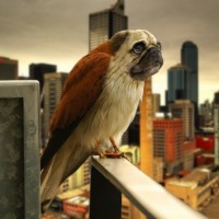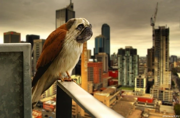 the body of a bird, which appears to be a falcon. This is an edited or photoshopped picture, as dogs and birds do not naturally share the same physical characteristics. The background suggests a city skyline, likely indicating that this image was created in