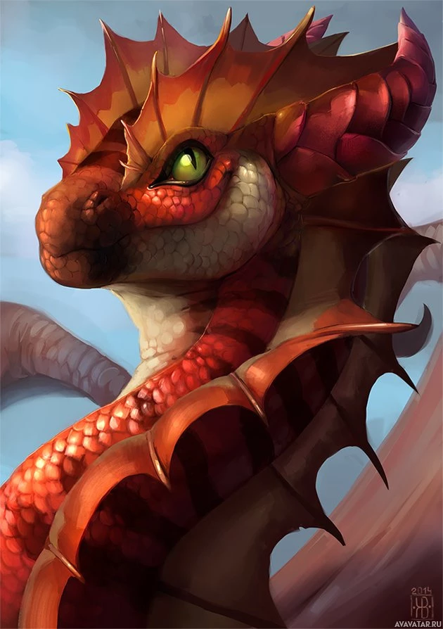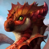 large eyes and spikes running along the top of its head. The dragon's expression seems to be one of curiosity or wariness. In front of the dragon, there are what appear to be wings extending outward from its back. The background appears to be