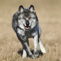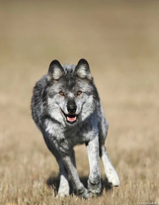 a grassy field with trees in the background. It appears to be captured mid-stride, conveying motion and freedom. The wolf has a distinctive appearance typical of its species, with a dense grayish-