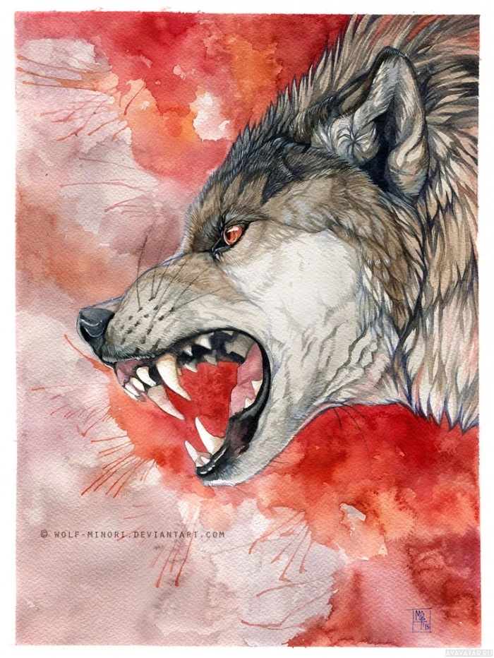 vibrant colors, primarily reds and oranges. The wolf has its mouth open as if it's growling or roaring, and its teeth are visible. There is also