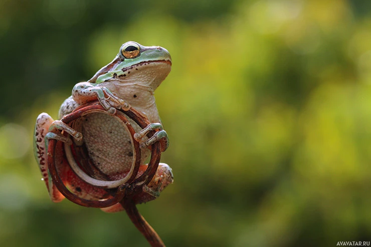 yellow eyes perched on what appears to be a plant. The frog is wearing a small