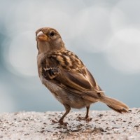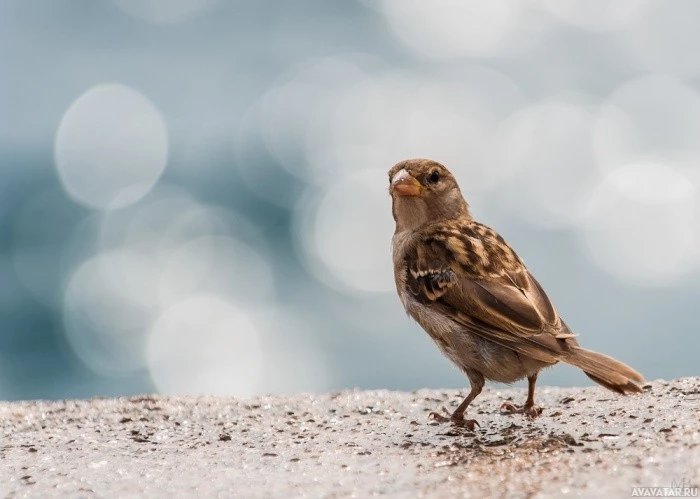 The image features a bird, specifically a sparrow, standing on what appears to be