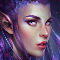 an illustrated character that appears to be a fantasy-inspired elf. The character has purple hair and is adorned with various intricate details, such as star-like patterns on their skin,