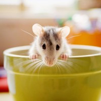 a small rodent, which appears to be an animal resembling a rat. It is peeking over the edge of a green bowl, seemingly interested or curious about its surroundings. The bowl is placed on what looks like a tabletop in a room with