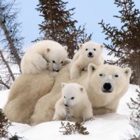 На картине изображена группа белых медведей. Есть два взрослых белых медведя и три детеныша. Они сидят в снегу, что характерно для их естественной среды обитания. Белые медведи являются родными для арктических регионов, поэтому это изображение, вероятно, захватывает их в дикой природе или в святилище, которое пытается имитировать их природную среду.