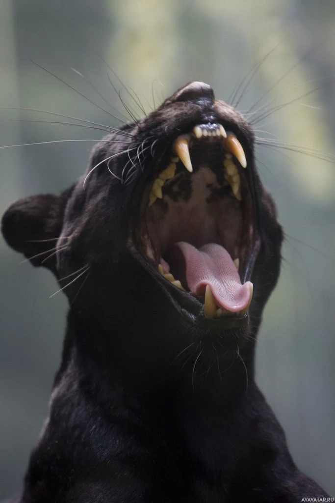 The image shows a close-up of an animal with its mouth wide open, displaying teeth. It is identified as a panther due to the presence of what appears to be a panther's snout and features such as whiskers and