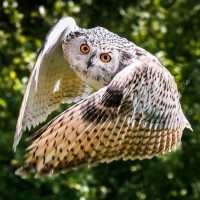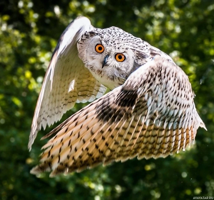 an owl in flight. The owl appears to be a species with large, rounded ears and distinctive, orange eyes that are widely open, which can be typical for species like